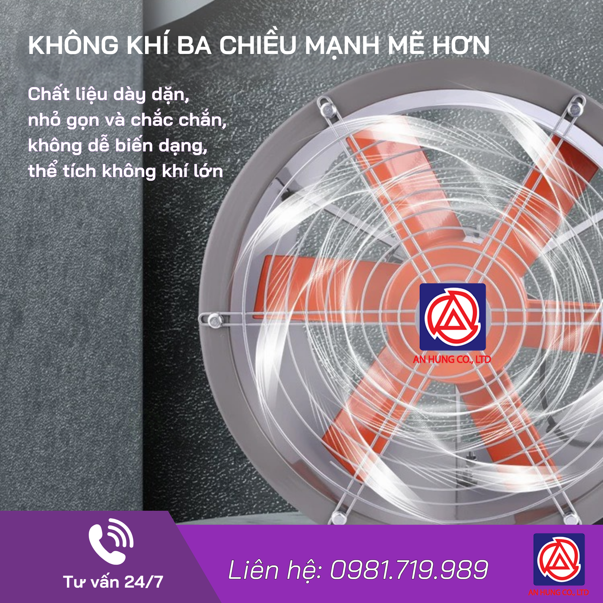 – Kết cấu bền vững: Thiết bị quạt hướng trục bao gồm vỏ quạt, guồng cánh được chế tạo bằng thép SS400 hoặc inox, cắt bằng laser, chấn CNC công nghệ Thụy Sỹ, hàn công nghệ cao nên mang tới độ bền vững chắc cho sản phẩm quạt hướng trục;